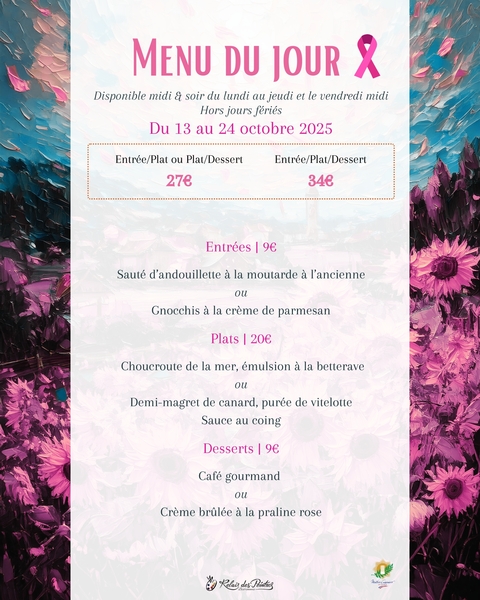 En soutien à Octobre Rose, notre menu du jour se pare de quelques notes colorées et de touches rosées, en clin d’œil à cette campagne de sensibilisation qui nous tient à cœur.